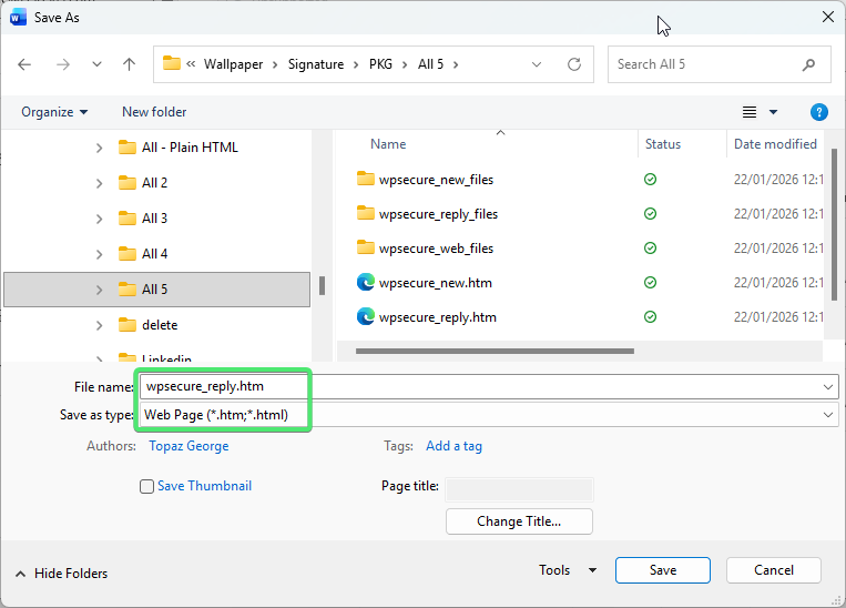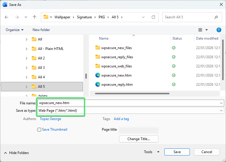 Microsoft Word is a highly effective tool for creating Outlook signatures in HTM format because it embeds images using VML, ensuring they display correctly across Outlook clients. When the HTM file is created using Microsoft Word, any images referenced within it are automatically stored in a folder named wpsecure_new_files. If this folder is present, it is automatically included as part of the signature package.