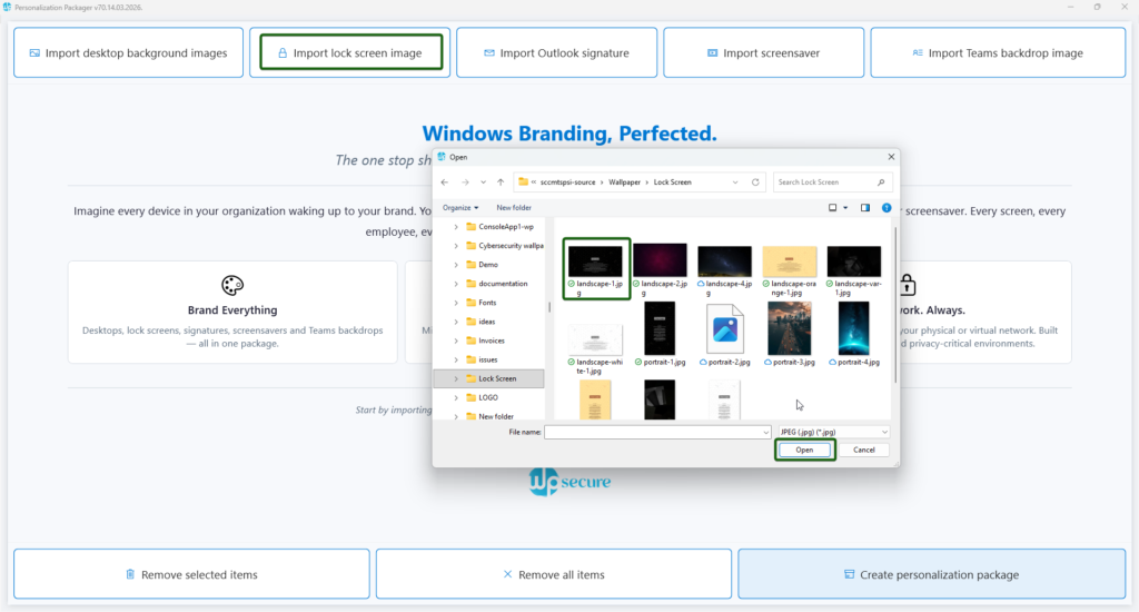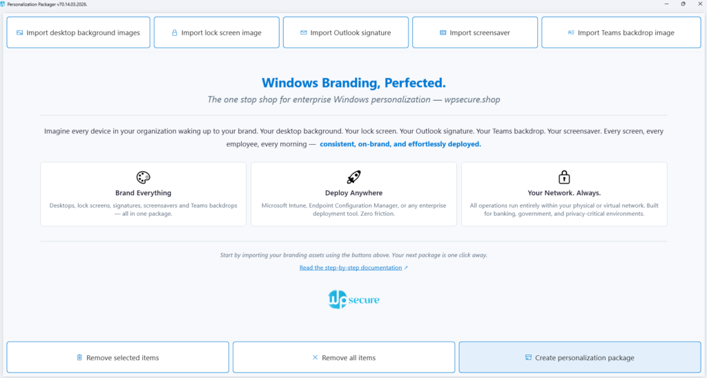 - WPSecure Personalization Packager: Deploy Outlook Signatures, Desktop Backgrounds, Lock Screen Images and Windows Screensavers. Create and deploy unlimited packages using software deployment tools like SCCM or Intune.