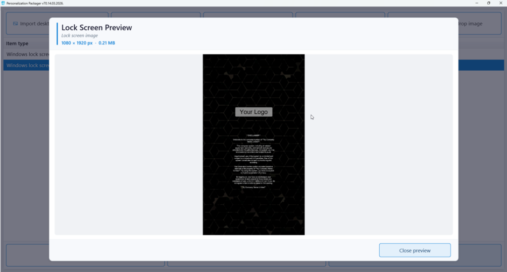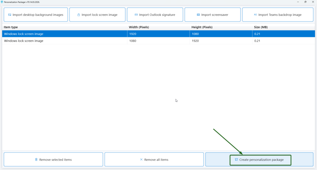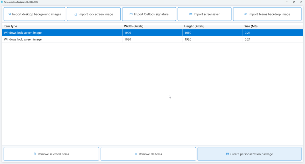 Use this button to export the personalization package to a folder. A personalization package is a collection of all the settings and files you have imported or created for your desktop backgrounds, Outlook signatures, and screensavers. The selected destination folder has to be empty. The personalization package creation process creates two folders: general_install and intune_install.