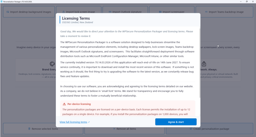 Click on the item called “WPSecure Personalization Packager.” Doing so will open the Packager in full-screen mode. Click the button at the bottom to agree to the terms and enter the application.