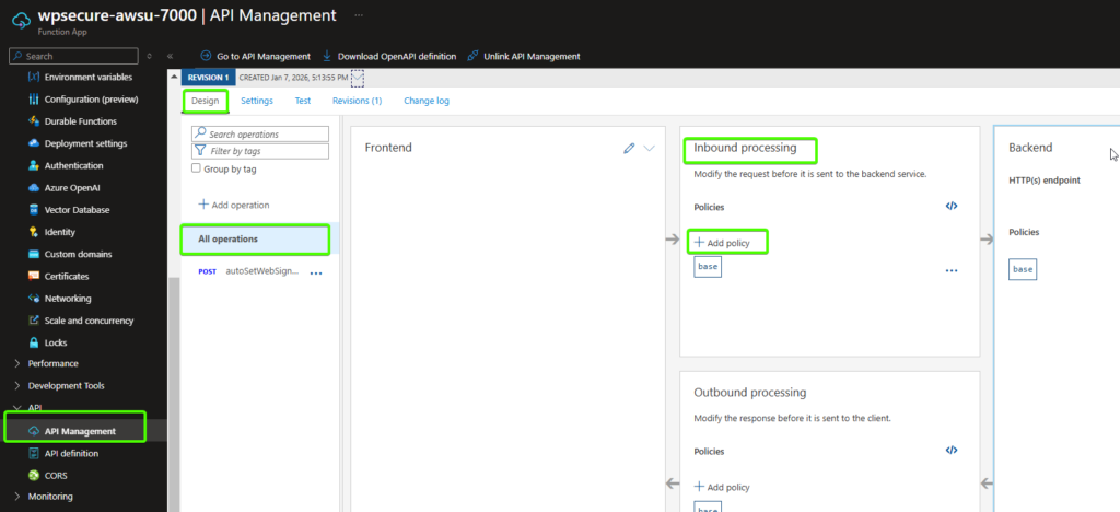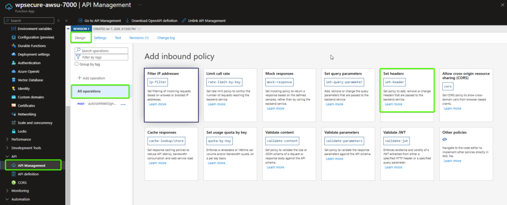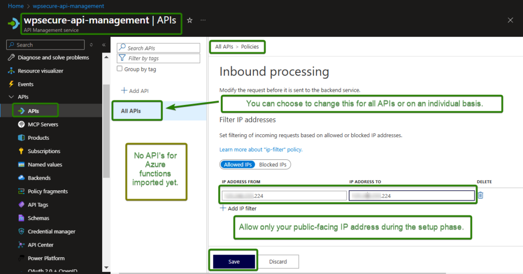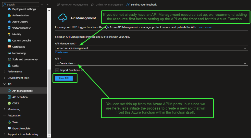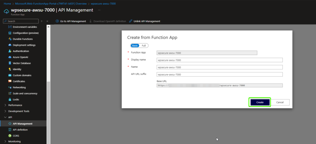 This tool integrates with Azure API Management (APIM) and Azure Functions. The provisioning, configuration, security, and ongoing management of Azure APIM and Azure Function Apps fall outside the scope of WPSecure package licensing and support.