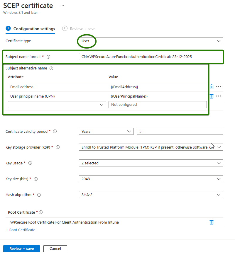 -subjectname | The Subject name of the certificate (sometimes called the Subject Common Name) issued by Cloud PKI or your Internal CA. Note: The Subject name should remain the same across all devices, while the Subject Alternative Name (SAN) must contain the UPN of the user. |