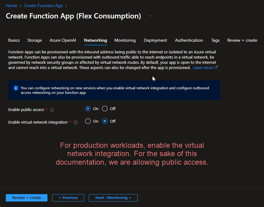 For production systems, do not enable public access to the Azure Function.