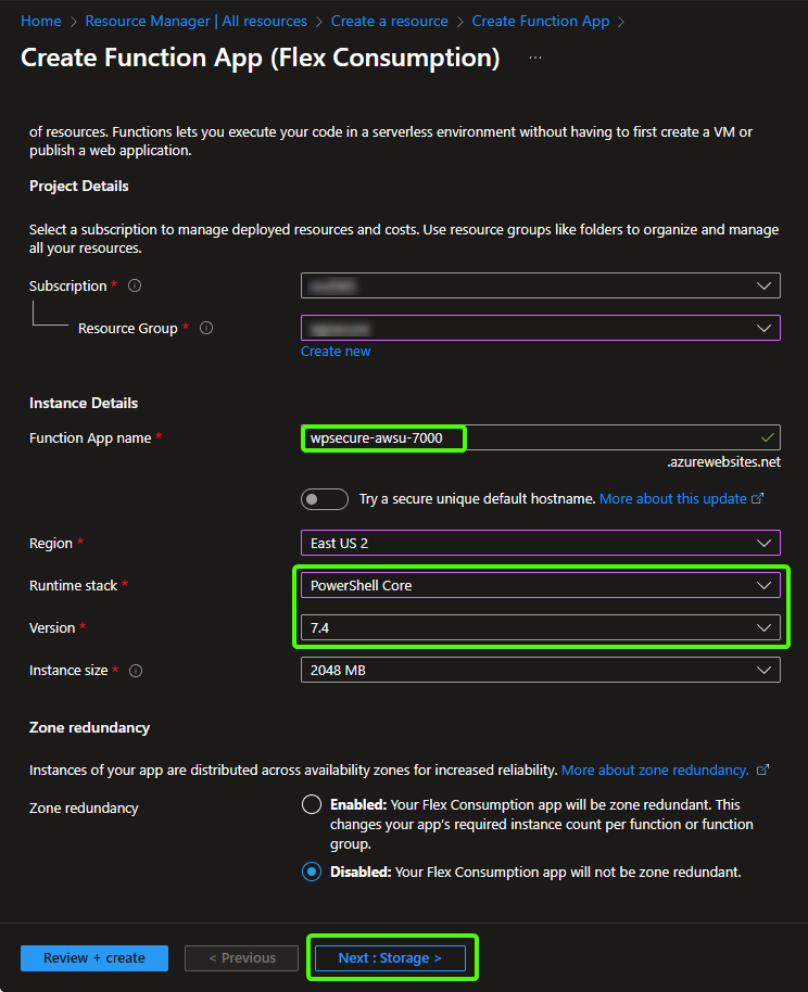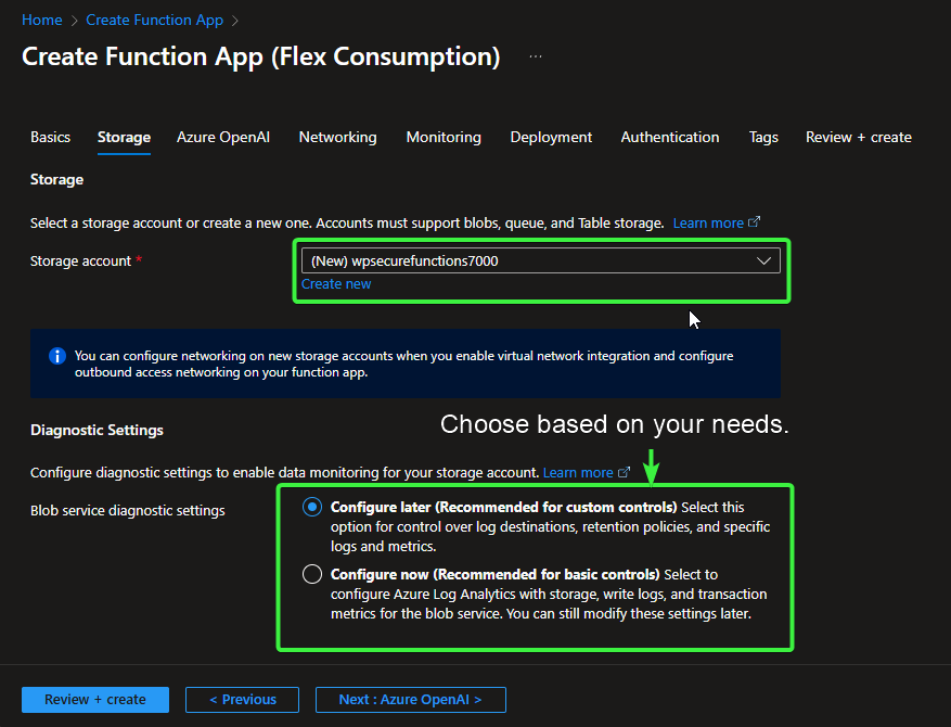 To simplify service association and maintain consistency, we recommend incorporating the same unique number from the previous step (e.g., naming the storage account wpsecurefunctions**** or similar, using your chosen 4–8 digit identifier). This helps keep all related WPSecure components easily identifiable and linked.