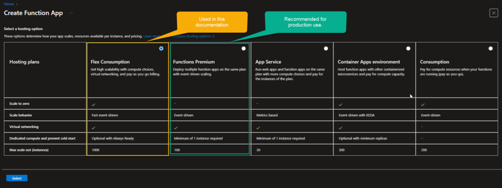 The Flex Consumption plan may experience cold starts, which can introduce latency during periods of inactivity. However, if cold start delays are acceptable for your use case, the Flex Consumption plan can also be used as a cost‑effective alternative.