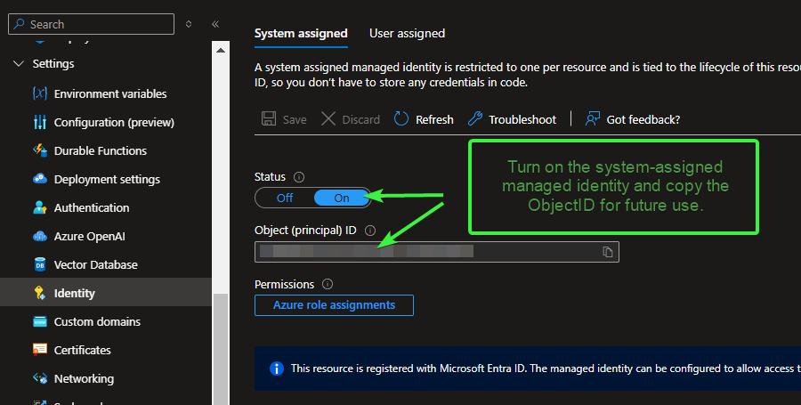 Go to Settings > Identity in the left-hand menu. Under the System assigned tab, set the Status to On. Click Save. After saving, the Object ID (also referred to as the Principal ID) will appear on the same page. Copy this Object (Principal) ID and paste it into Notepad (or your preferred text editor) for use in subsequent steps.