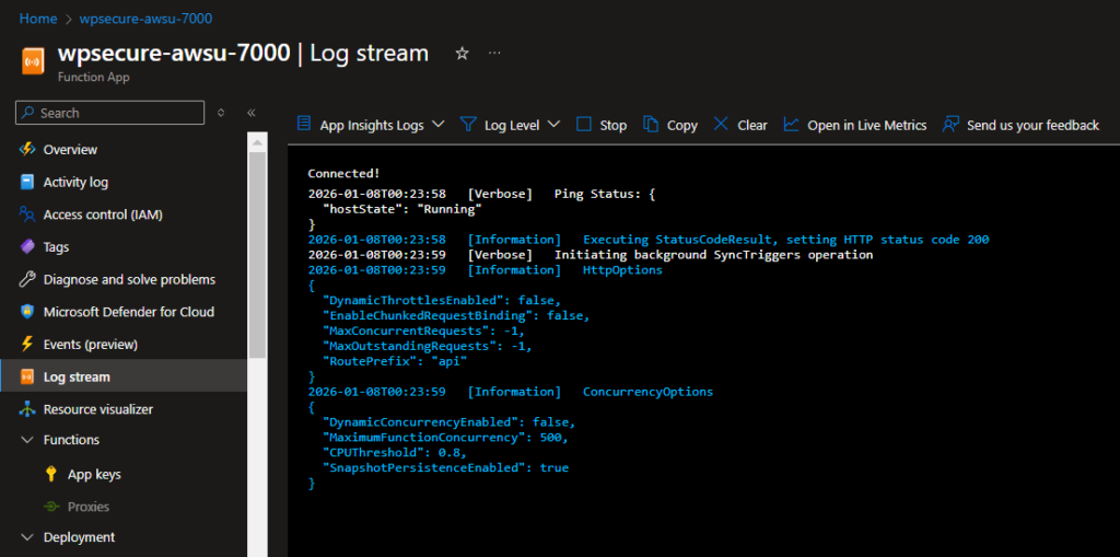 Reaching a fully autonomous state, however, can be challenging during initial setup. In these scenarios, the Azure Function Log stream becomes an essential tool for diagnosing and resolving issues.