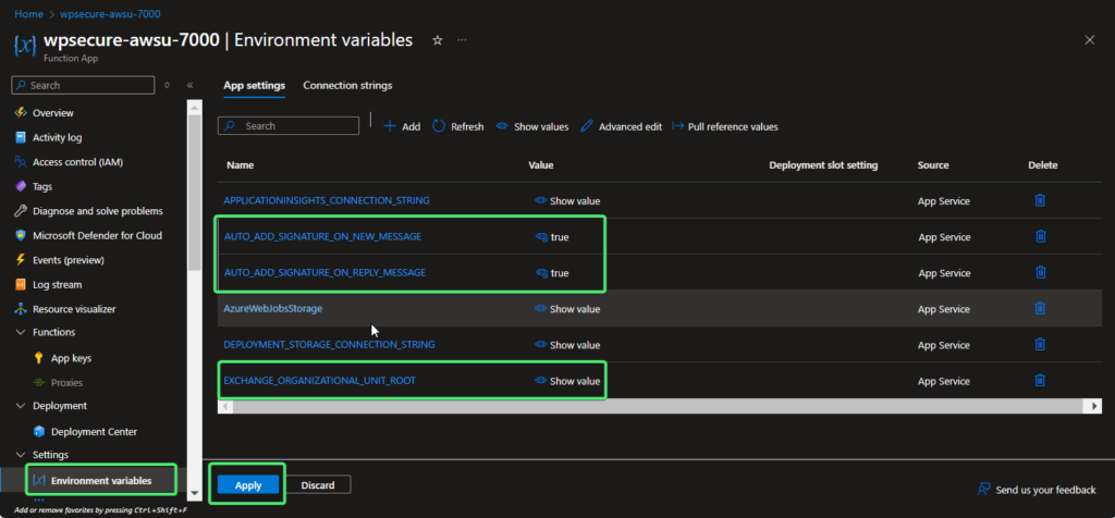 Set Azure Function App Environment variables
