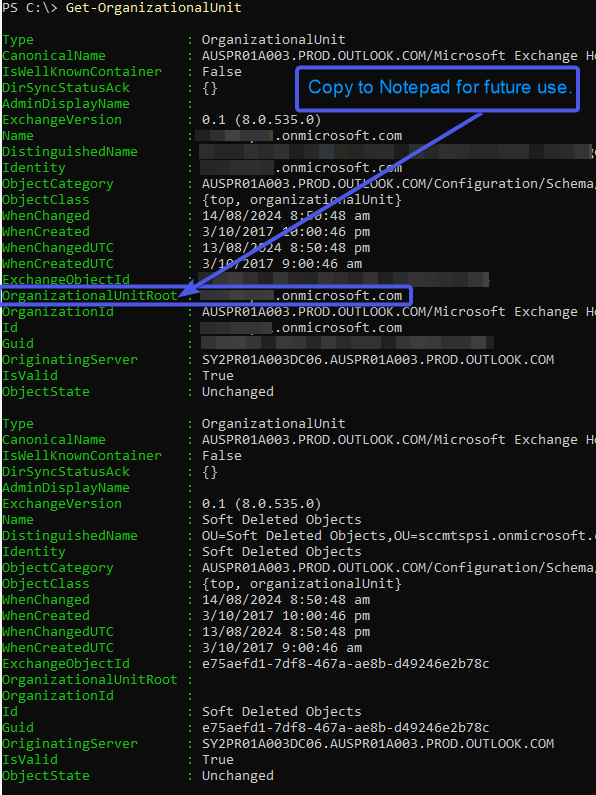 Open Powershell on your computer and run the following commands. You will need the ExchangeOneline PowerShell module installed to run the below commands. You will have to run the below commands as an Exchange Administrator. Copy and paste the value corresponding to the ‘OrganizationalUnitRoot’ attribute to Notepad for future reference.