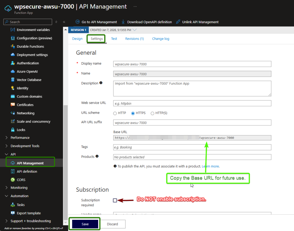 Click on the Settings tab, copy the Base URL for future use, and then ensure that the Subscription Required option is UNCHECKED. Click Save.