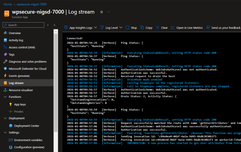 Reaching a fully autonomous state, however, can be challenging during initial setup. In these scenarios, the Azure Function Log stream becomes an essential tool for diagnosing and resolving issues.