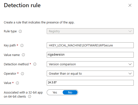 To detect the setting’s presence, set your detection methods to look for the following registry value and use the operator “greater than or equal to” to compare the value as a TYPE: Version.