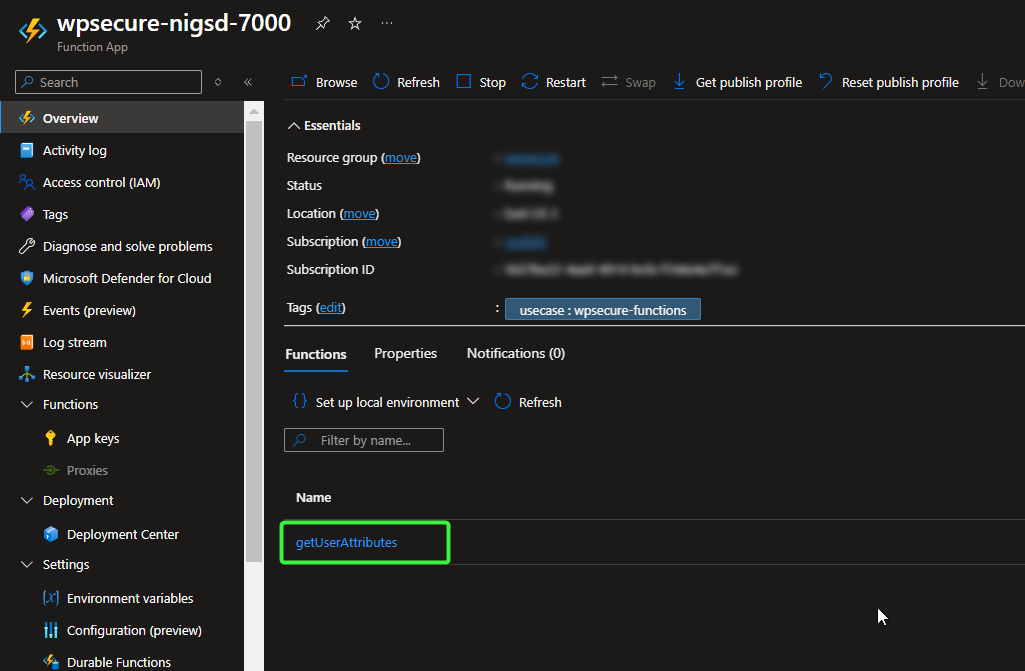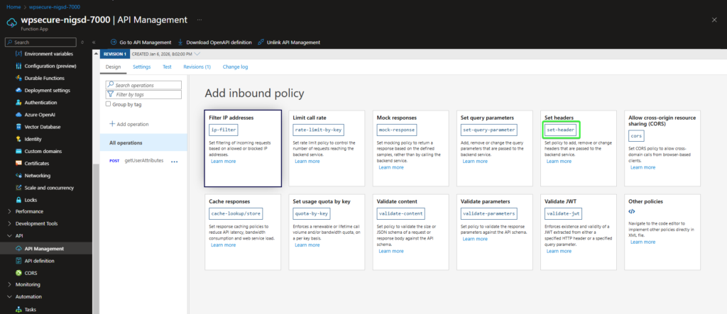 The Azure Function | The Azure Function acts as the core computational component within the solution architecture. It receives requests from the WPSecure engine through the Azure API Management (APIM) layer, where it performs the necessary data processing and transformation. The function then queries Microsoft Entra ID via the Microsoft Graph API to retrieve the required user attributes for the specified User Principal Name (UPN). From a security and access‑control standpoint, the Azure Function is not intended to be publicly accessible. It should be configured to accept inbound requests exclusively from the Azure APIM endpoint. This ensures that all traffic to the function is centrally governed by APIM, allowing authentication, request validation, throttling, and policy enforcement to be consistently applied before execution. |