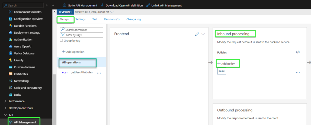Once successfully authenticated, APIM forwards the request to the backend Azure Function. The function itself is not directly exposed to the public internet and relies on APIM as its primary security boundary, thereby reducing the attack surface and centralizing access control and policy enforcement.