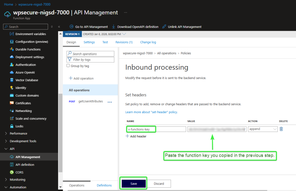 Set the header value for x-functions-key by using the function key you copied in the previous steps. Click Save.