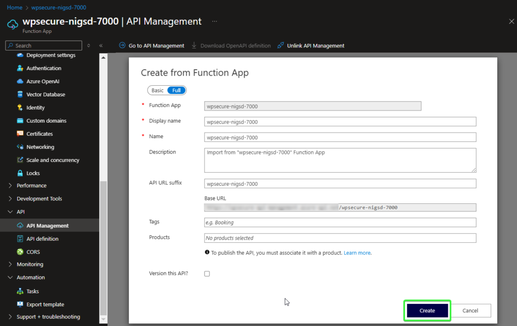 This tool integrates with Azure API Management (APIM) and Azure Functions. The provisioning, configuration, security, and ongoing management of Azure APIM and Azure Function Apps fall outside the scope of WPSecure package licensing and support.
