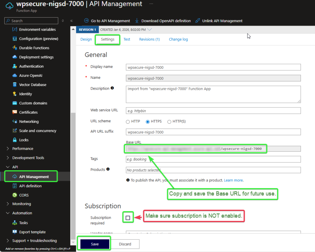 Click on the Settings tab, copy the Base URL for future use, and then ensure that the Subscription Required option is UNCHECKED. Click Save.
