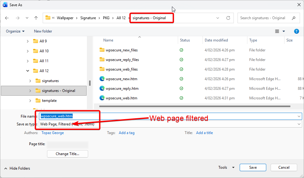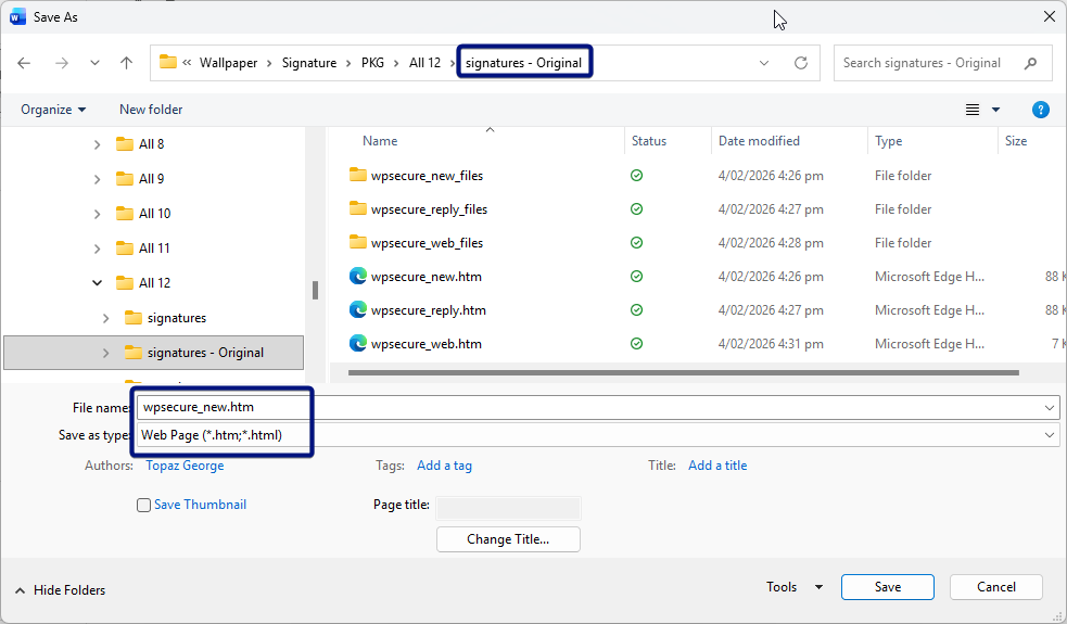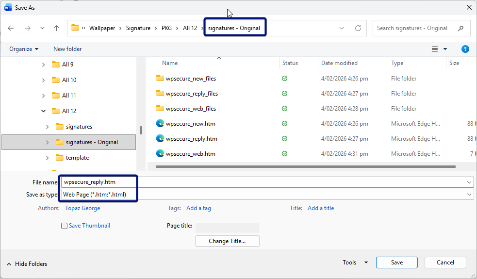 Microsoft Word is a highly effective tool for creating Outlook signatures in HTM format because it embeds images using VML, ensuring they display correctly across Outlook clients. When the HTM file is created using Microsoft Word, any images referenced within it are automatically saved in a folder named wpsecure_new_files. If this folder is present, it is automatically included as part of the signature package.