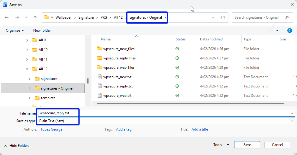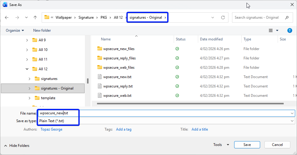 It’s time to create the Text File (.txt) versions of your templates. Open each of your Word document templates and save a copy as a .txt file. These TXT files will be used—if available—by both Outlook Classic and Outlook on the Web / Outlook New when a plain‑text version of the signature is required.