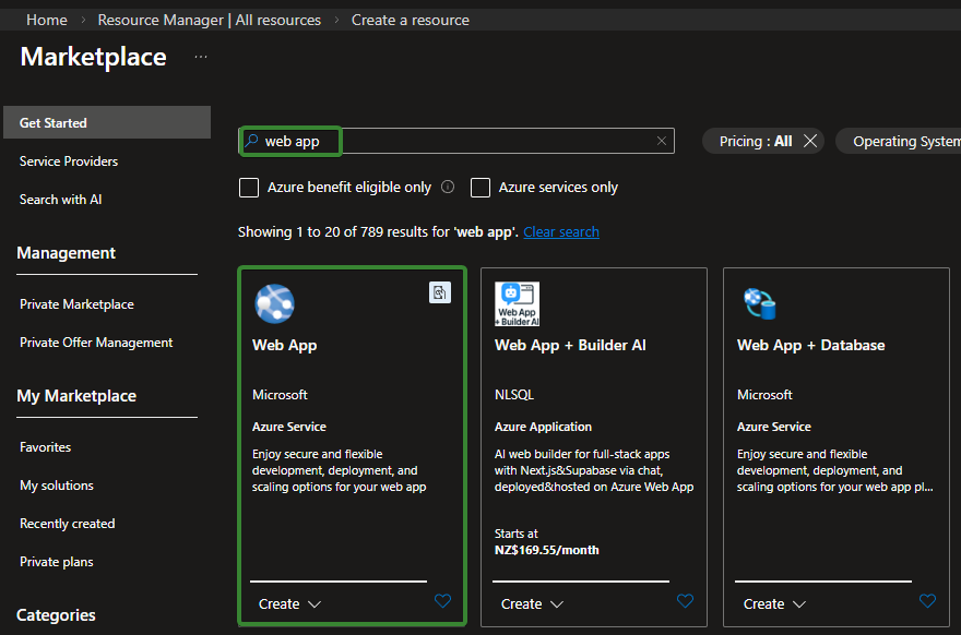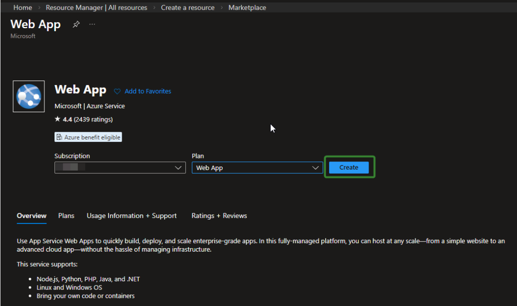 To create an Azure Web App, sign in to the Azure Portal and use the search bar at the top to locate Web App. Open the Web App blade and click Create to start the deployment process. This launches the Create Web App wizard, where you will select your subscription, choose or create a resource group, and assign a unique name to the Web App. You will then configure the runtime stack, operating system, and choose an App Service Plan that defines the hosting capacity. After reviewing each section, select Review + Create. Once validation completes successfully, choose Create to provision the new Web App.