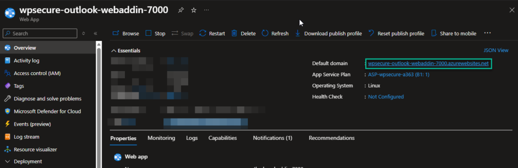 f9de811a-1855-4ad7-b618-1126d6d87b8cis the Application (Client) ID that was copied into the Notepad file. Automatically populated.wpsecure-outlook-webaddin-7000.azurewebsites.netis the Default Domain value that was also copied into the Notepad file.