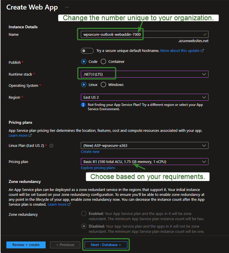 It is important that you set the Runtime stack to .NET 10 (LTS). The Pricing plan should be selected based on your organization’s performance and capacity requirements. Each New Outlook and Outlook on the Web client will, on average, check back with the Web App every 4 hours to determine whether any signature files have changed (this interval can be adjusted from the Azure Web App settings page).