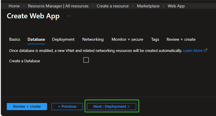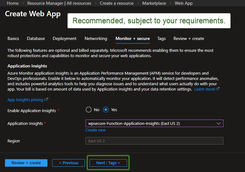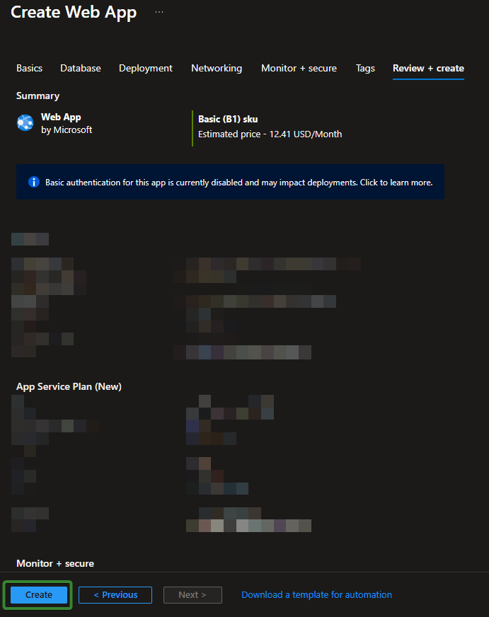 Click Next to continue through the remaining screens. Make sure you enable Application Insights, as this will allow you to monitor the Log Stream for errors, performance issues, and security‑related events. On the final screen, click Create to complete the deployment.