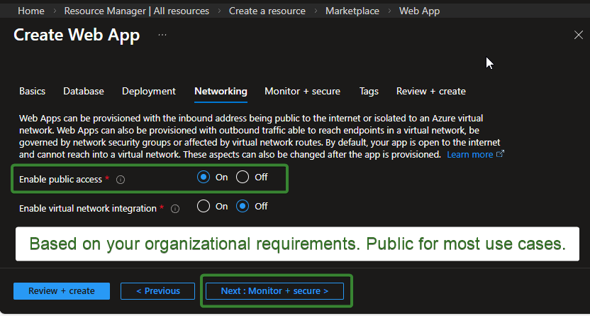Click Next to continue. For the purposes of this article, we will enable public access. Most customers keep this setting enabled because the Azure Web App must be publicly reachable but privately authenticated. In our scenario, only users of New Outlook and Outlook on the Web—who have already authenticated into Outlook and received a valid token—will be able to get their Outlook email signatures from the Web App.