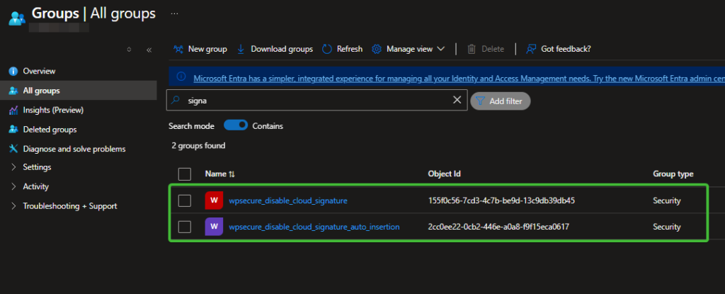 Create 2 EntraID groups. These groups serve to hold users who will be exempt from getting the signature or just automatically inserting the signature using the Outlook add-in.