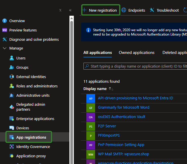 Navigate to App Registrations: Inside the Entra ID blade, select App registrations from the left‑hand menu. To start a new App registration click ‘New registration‘ at the top of the App registrations page to begin the setup process.