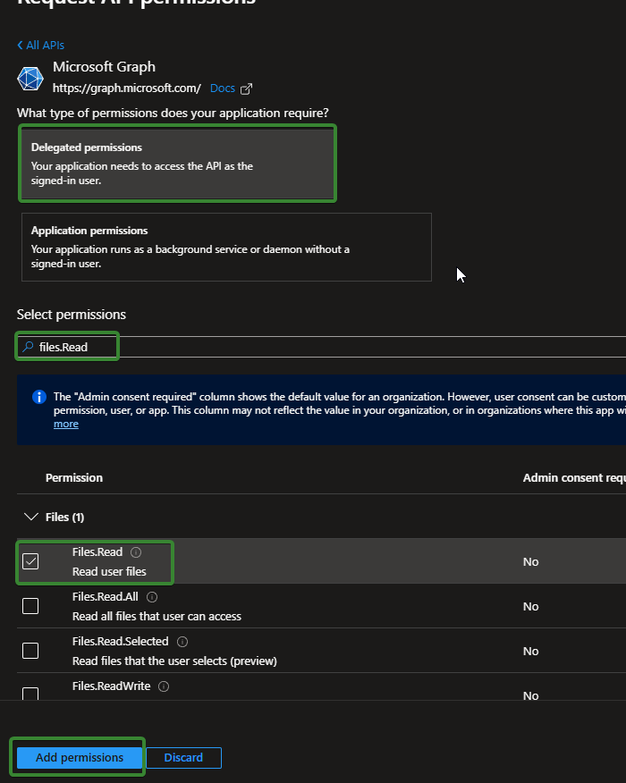 Choose Delegated permissions, then search for and select Files.Read, User.Read, and GroupMember.Read.All as shown in the images below.