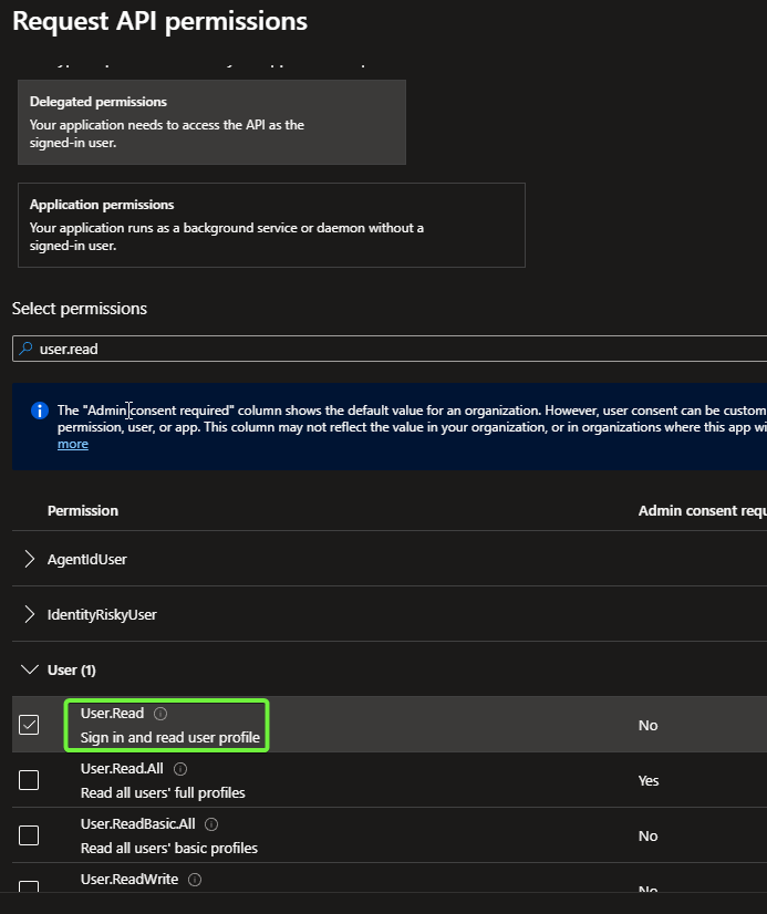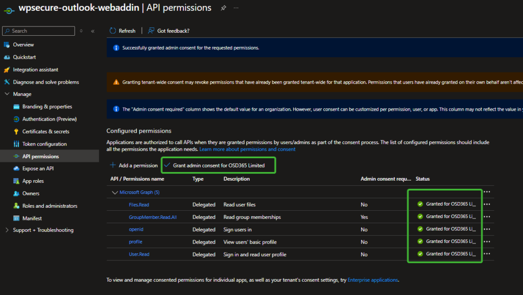 !!!!! Finally, the most important step is to ‘Grant admin consent‘. After adding an admin consent, you should see five items in the list, as shown in the image below. If you do not, you have missed one or more of the above steps.