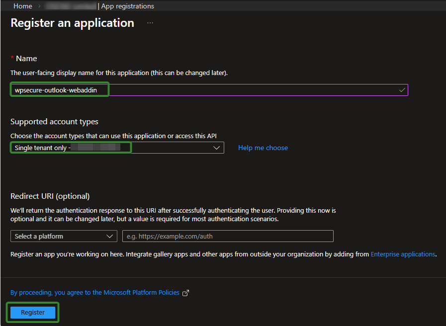 In the Register an application window, enter wpsecure‑outlook‑webaddin as the application name. For Supported account types, select Single tenant.