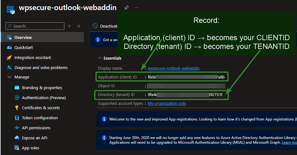After completing the registration, the first step is to copy the Application (Client) ID and the Directory (Tenant) ID.