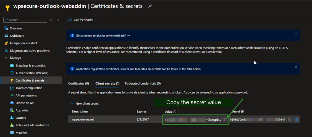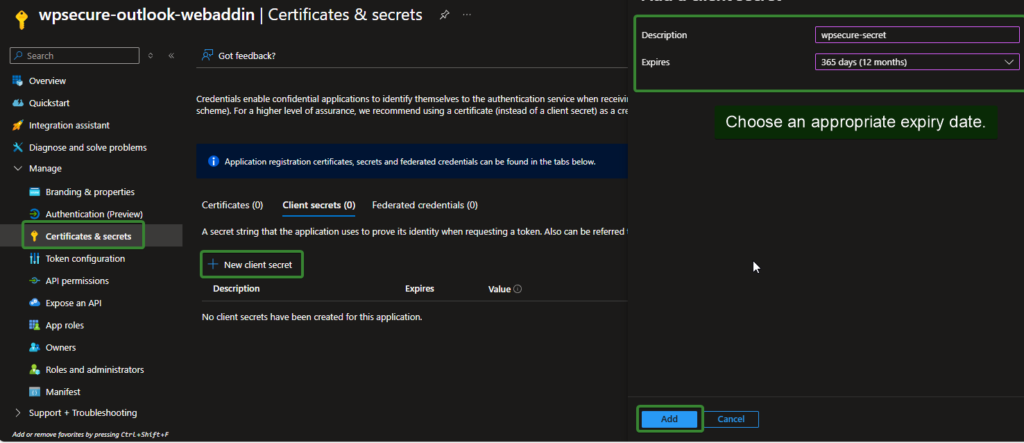 Click Certificates & Secrets in the left‑hand menu, then create a new client secret. Set the expiration period according to your organization’s security governance requirements.