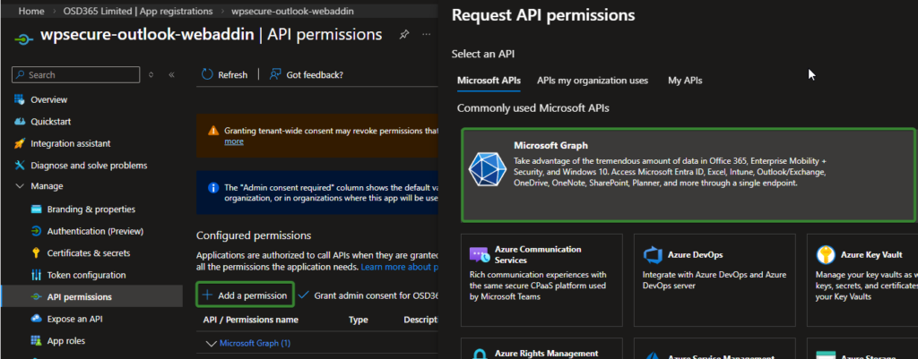 Select API permissions from the left‑hand menu. Click Add a permission and choose Microsoft Graph.