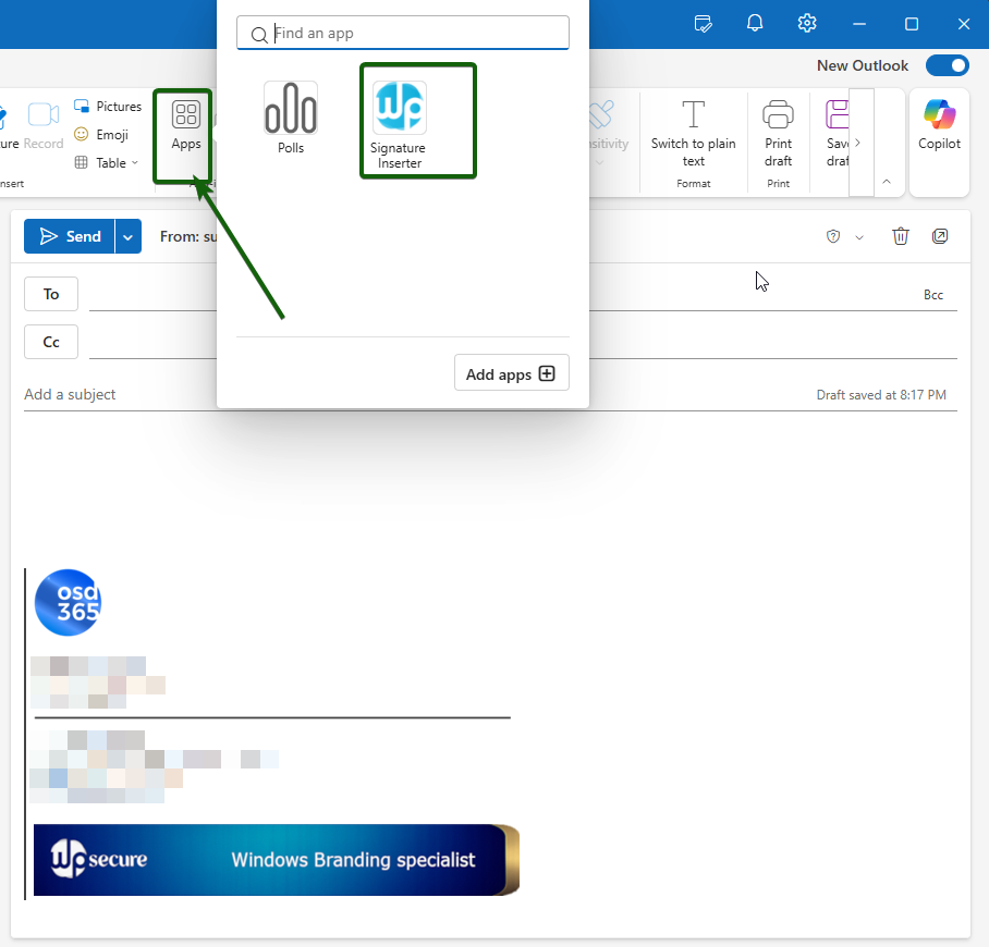 This article provides a step‑by‑step guide to deploying the WPSecure Signature Inserter Outlook web add-in, which facilitates signature insertion into email messages (new and reply/forward) when using New Outlook and Outlook on the Web.