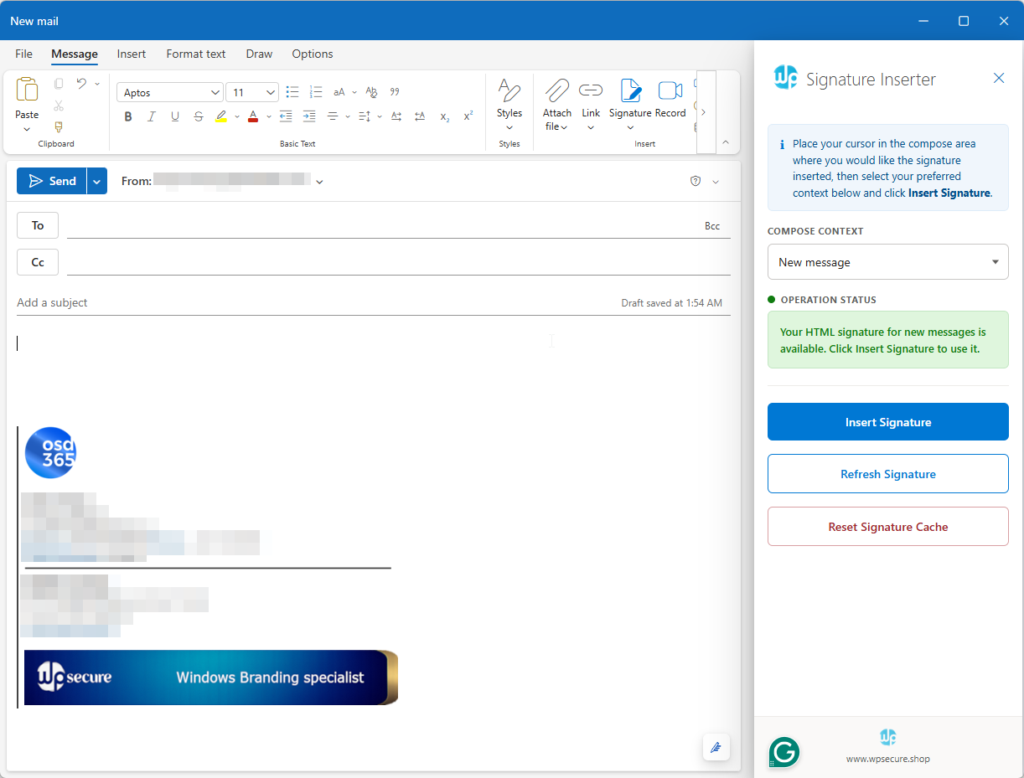 | wpsecure_cloud_new.txt | Inserted as the signature for New messages composed in TXT format for Outlook New and Outlook on the Web. |