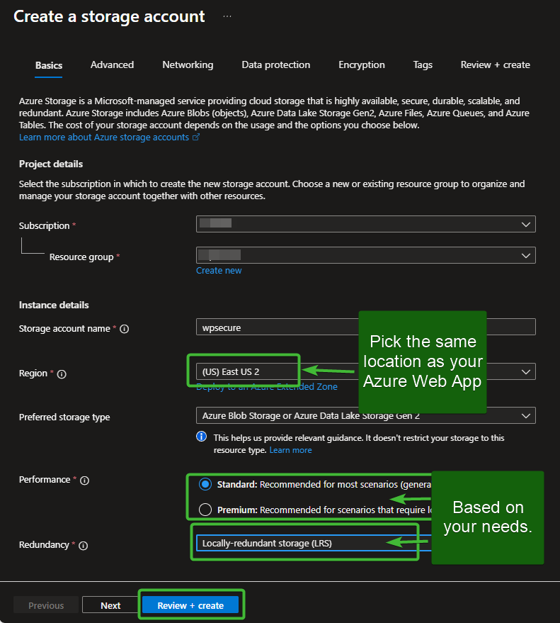 Must be globally unique, lowercase, e.g.,wpsecurestorage01. - Region: Pick the same or the closest region to the Azure Web App.