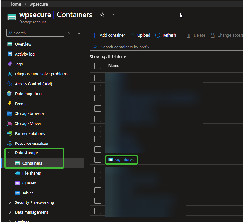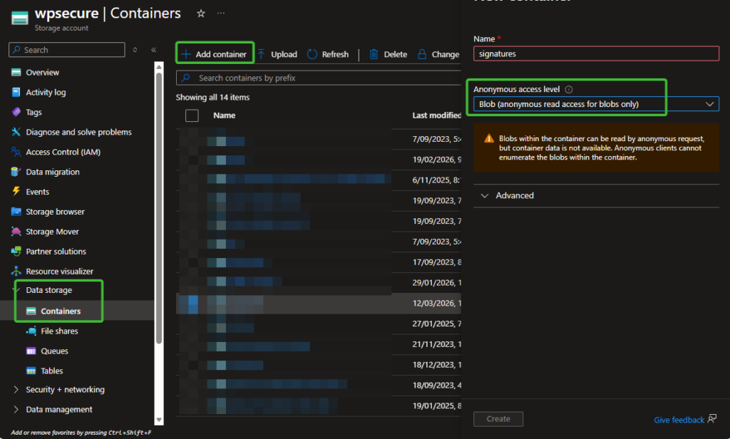 In the left navigation panel, select Containers under Data Storage and create a container.