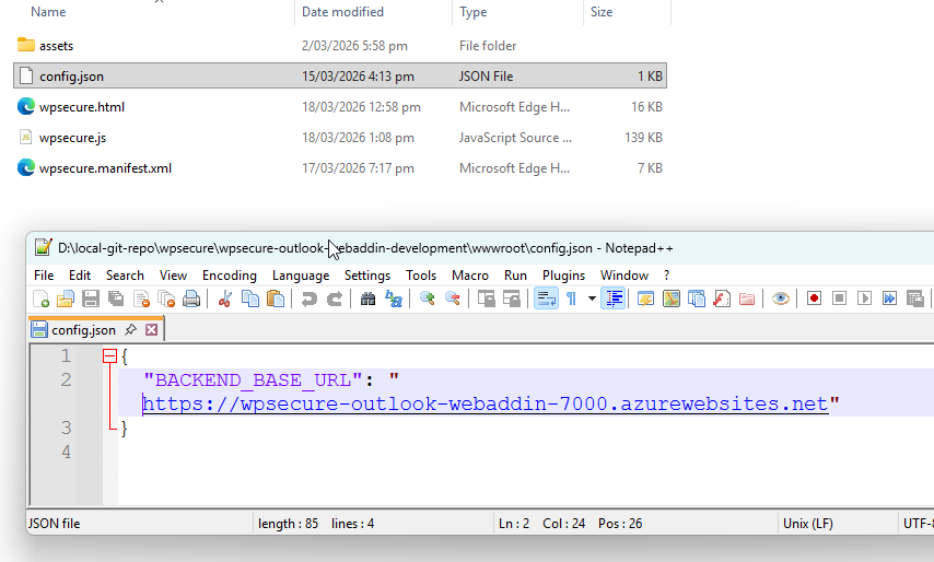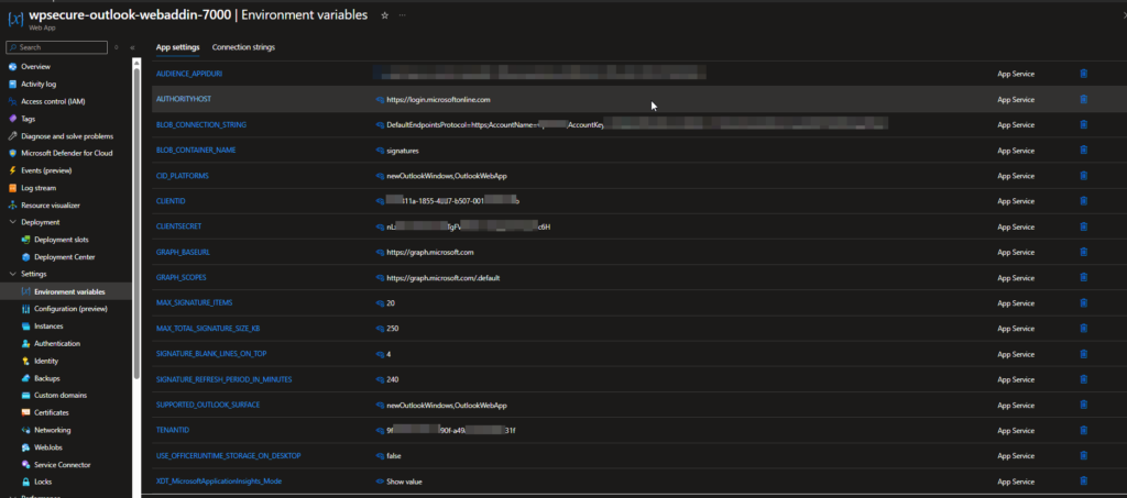 These are the settings that control the Outlook Add-in's behaviour. They are configured in the Azure App Service under Configuration → Application Settings.