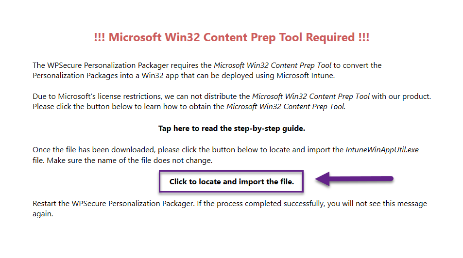 The WPSecure Personalization Packager requires the ‘Microsoft Win32 Content Prep Tool’ to convert the Personalization Packages into a Win32 app that can be deployed using Microsoft Intune.